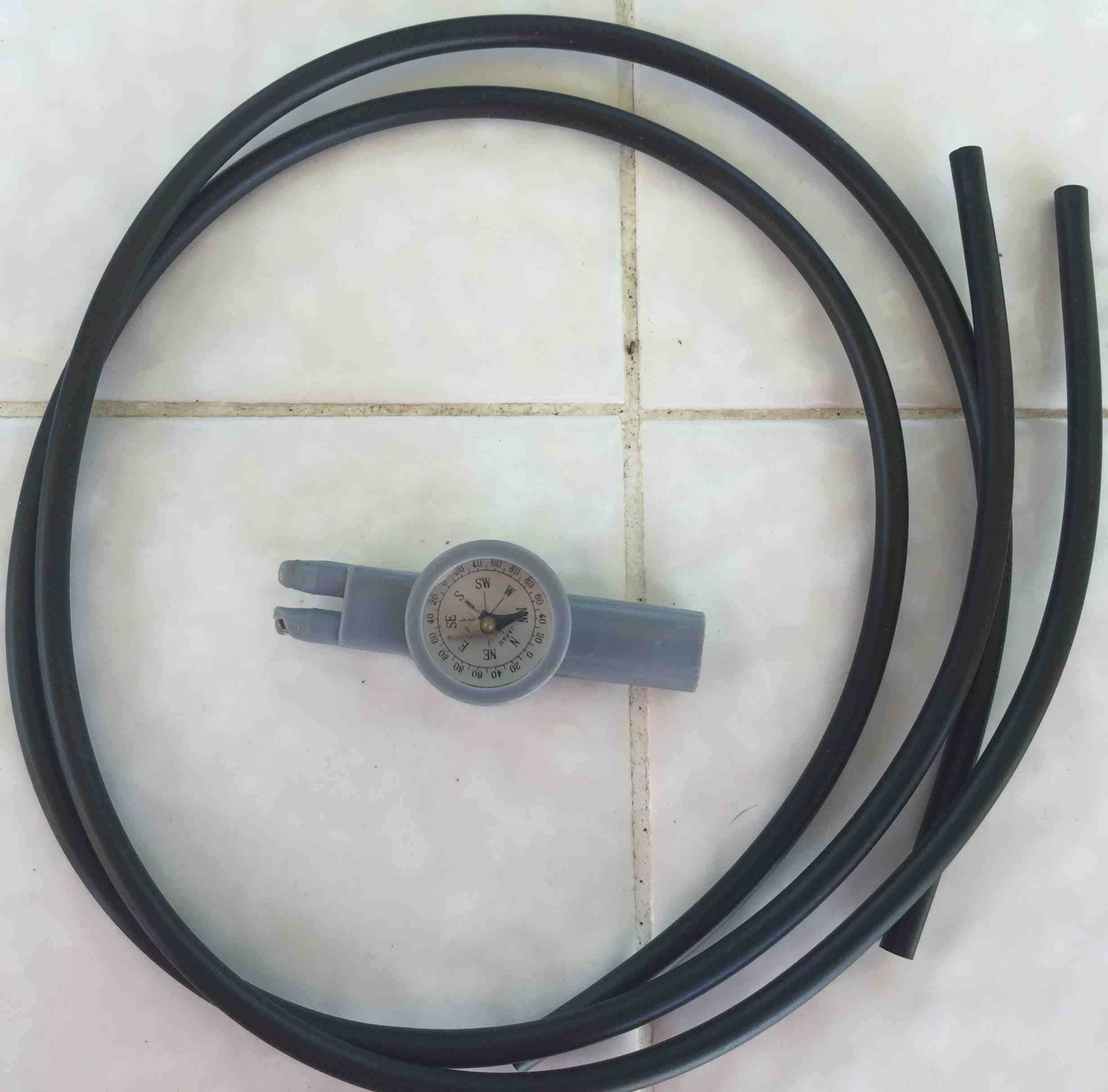 This is a nice set of original hoses, still curled up in the original shape from the package. They are original length and have not been messed with. The mouthpiece is included and the little compass still works great. There is some wear on it including some little scuffs and one very small melt mark on the back. It is very affordable though at $10