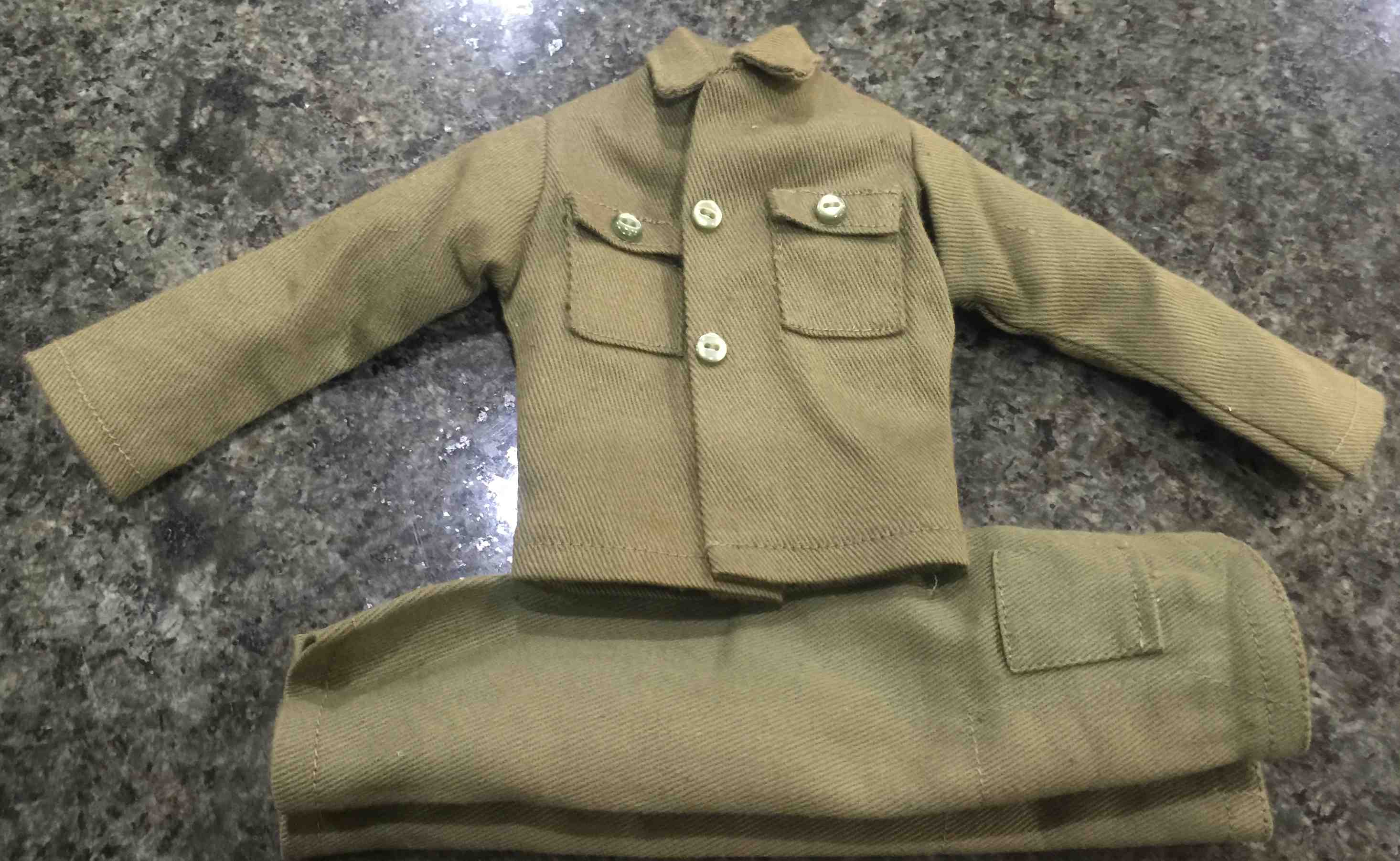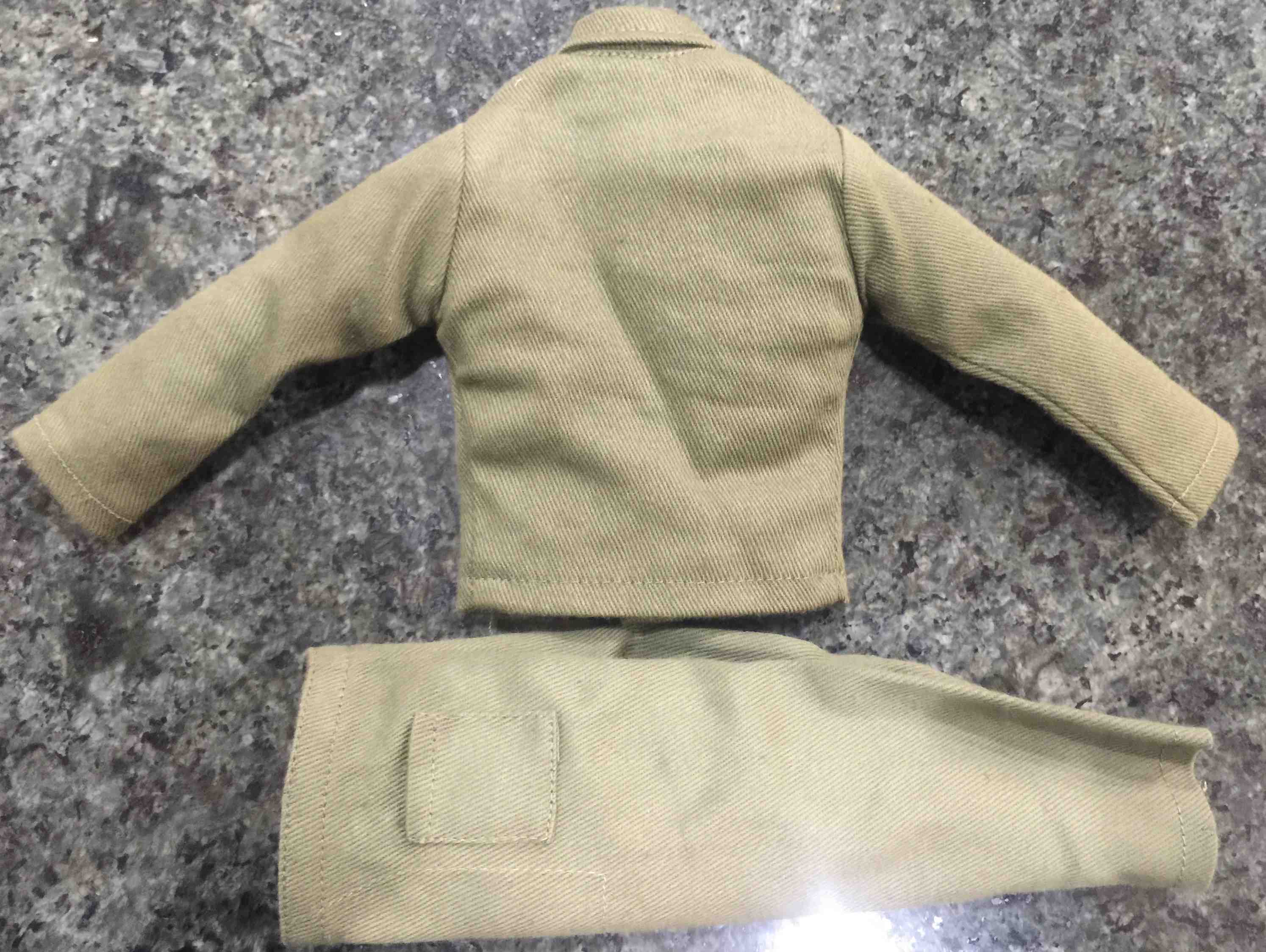 HERE IS A PHOTO SHOWING THE BACK OF THE UNIFORM WHICH IS THE KIND YOU FIND ON THE INDIVIDUAL CARDS, THE DELUXE CARDED SOLDIER UNIFORM WITH TWO POCKETS ON THE JACKET AND PANTS