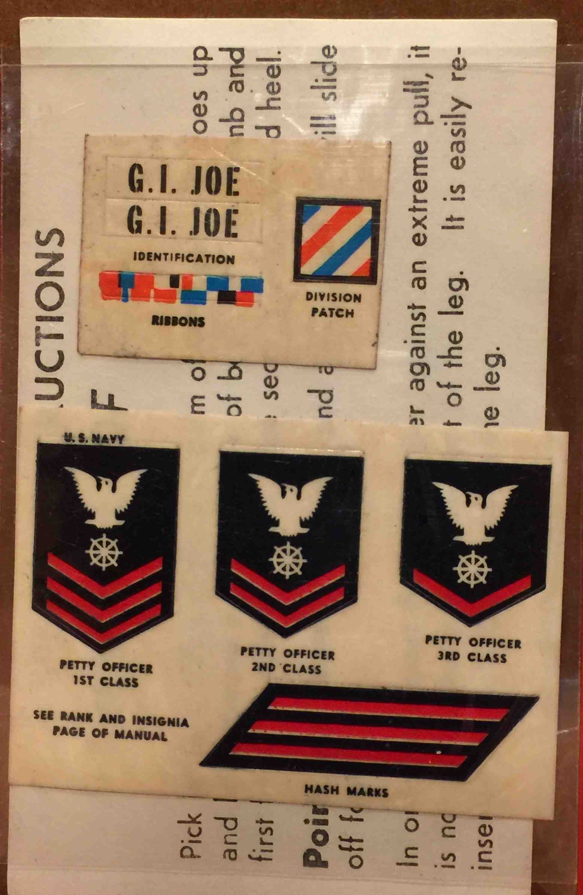 ITEM #407 - VINTAGE GIJOE ACTION SAILOR RANK AND INSIGNIA STICKER SHEETS WITH BOOT REMOVAL INSTRUCTIONS